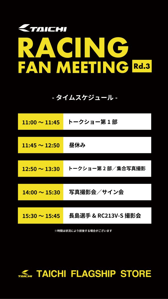 TAICHI FLAGSHIP STOREにて、今年も大いに日本のロードレースを盛り上げた長島哲太選手、渥美心選手、羽田太河選手、鈴木光来選手をお招きし、TAICHI RACING FAN MEETING Rd.3を開催いたします。