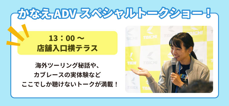 かなえADVさんがトークショーのMCとなり、海外ツーリング秘話やカブレースの実体験など、ここでしか聴けないトークが満載です。