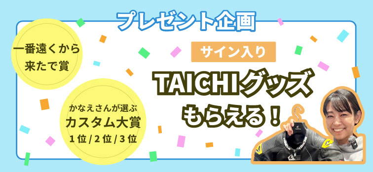 バイク系YouTuberのかなえADVさんが主催となり、スペシャルトークショーやサイン入りのTAICHIグッズがもらえるプレゼント企画を実施します。