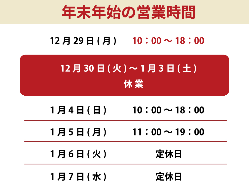 年内は12月29日(月)が最終営業日、年始は1月4日(日)より営業いたします。
